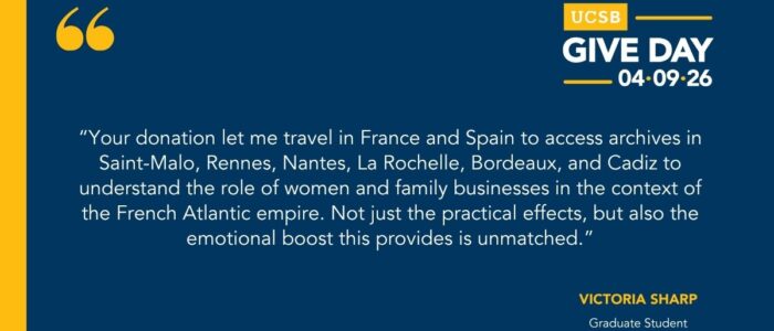 The History Department supports undergraduate and graduate research, events, and public engagement with history at UC Santa Barbara, the city of Santa Barbara and beyond. Consider joining us with a gift of any size!